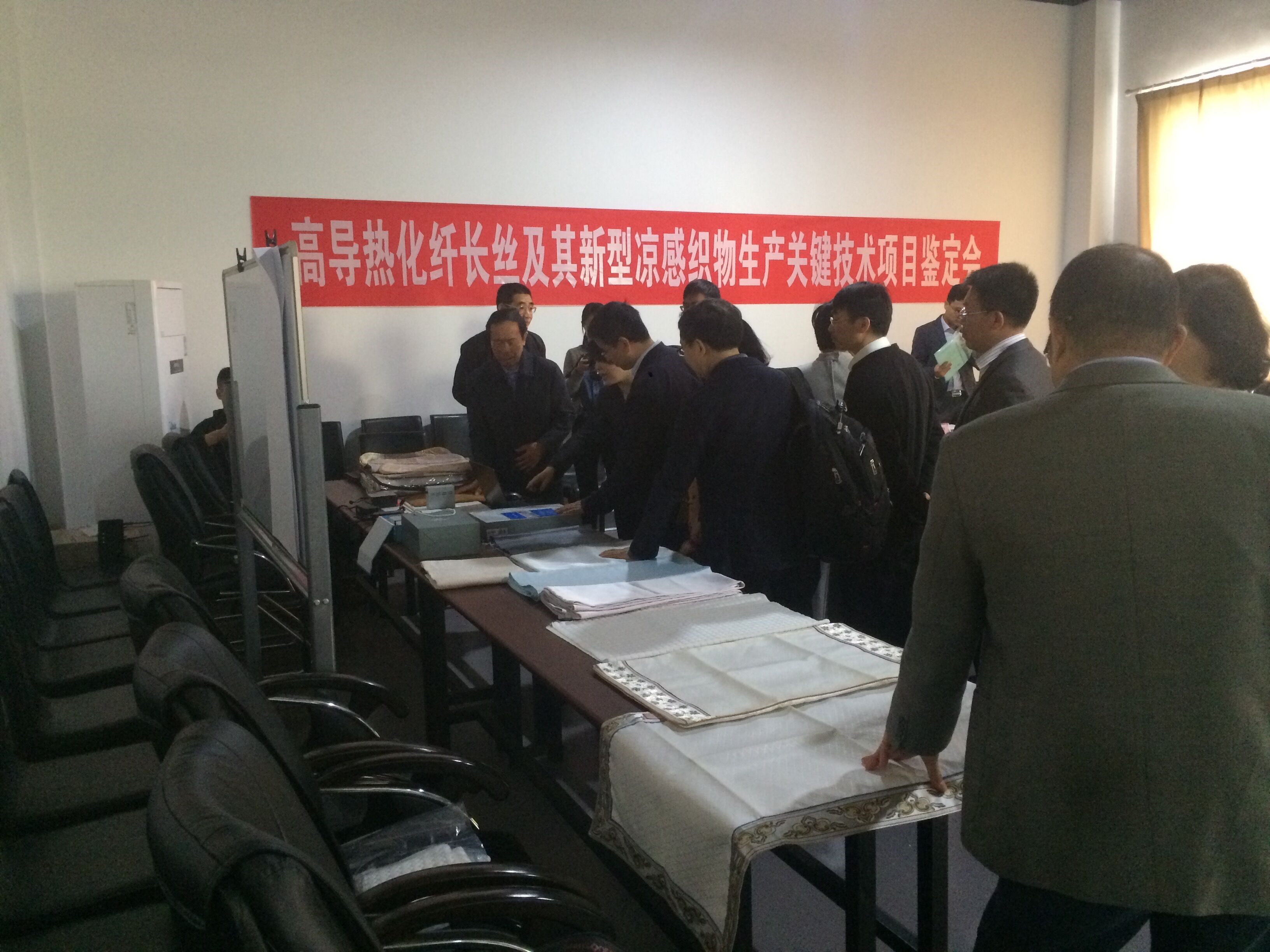 2017年427日,中國(guó)紡織工業(yè)聯(lián)合會(huì)組織召開了高導(dǎo)熱化纖長(zhǎng)絲及其新型涼感織物生產(chǎn)關(guān)鍵技術(shù)項(xiàng)目鑒定會(huì)(見圖1、圖2)。其中,由我公司和總后軍需研究所合作研制的用于測(cè)試涼感織物涼爽性能的快速響應(yīng)式FFZ415熱流式織物涼感測(cè)試儀,受到了鑒定委員會(huì)的認(rèn)可,項(xiàng)目順利通過鑒定。